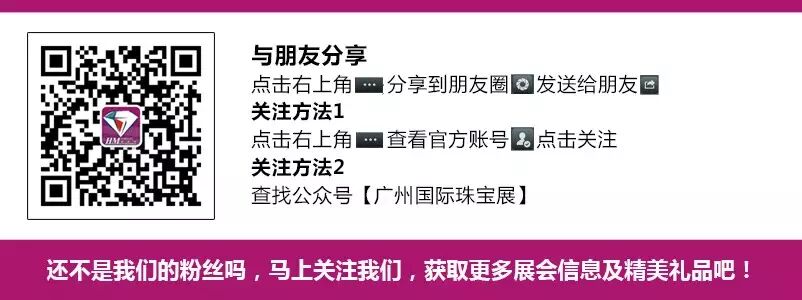 观众关注“广州国际珠宝展”微信号并转发,可免费领取展会门票,并有机会获得精美首饰一份,主办方希望能让市民在尽享各国珠宝惊艳之美的同时,还能通过不同形式获得心仪礼品,可说是超值的寻宝之旅。